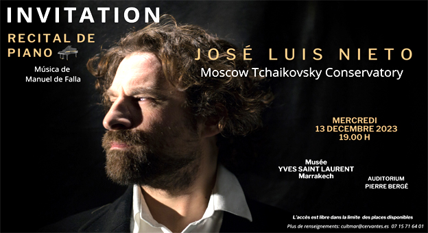 (FUNIBER) والجامعة الأوروبية للمحيط الأطلسي، بشراكة مع متحف إيف سان لوران بمراكش، حفلا موسيقيا لعازف البيانو الإسباني خوسيه لويس نييتو، يوم الأربعاء 13 دجنبر، بقاعة بيير بيرجي بمتحف إيف سان لوران بمدينة مراكش.